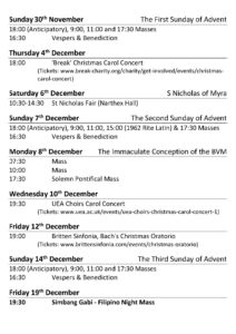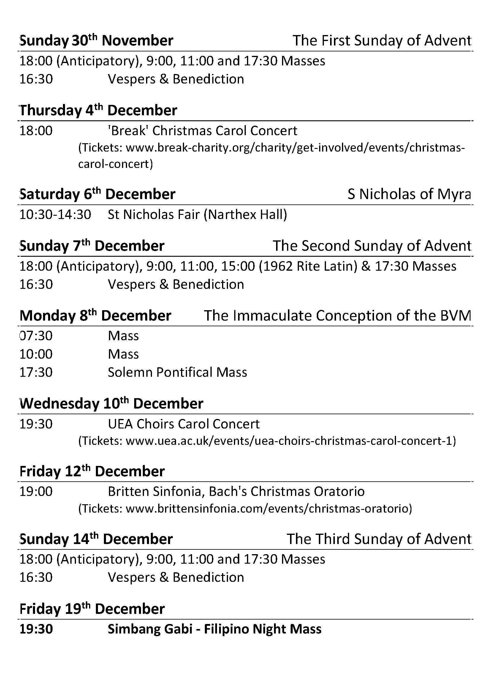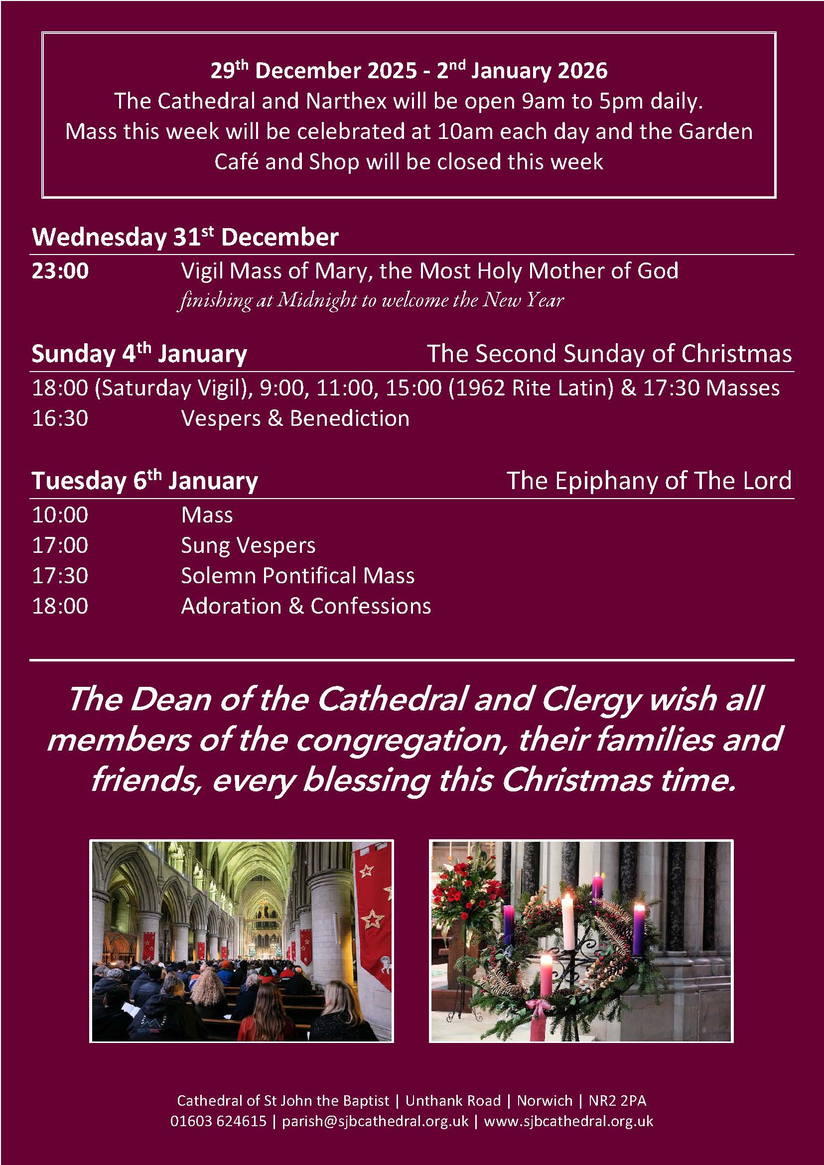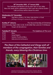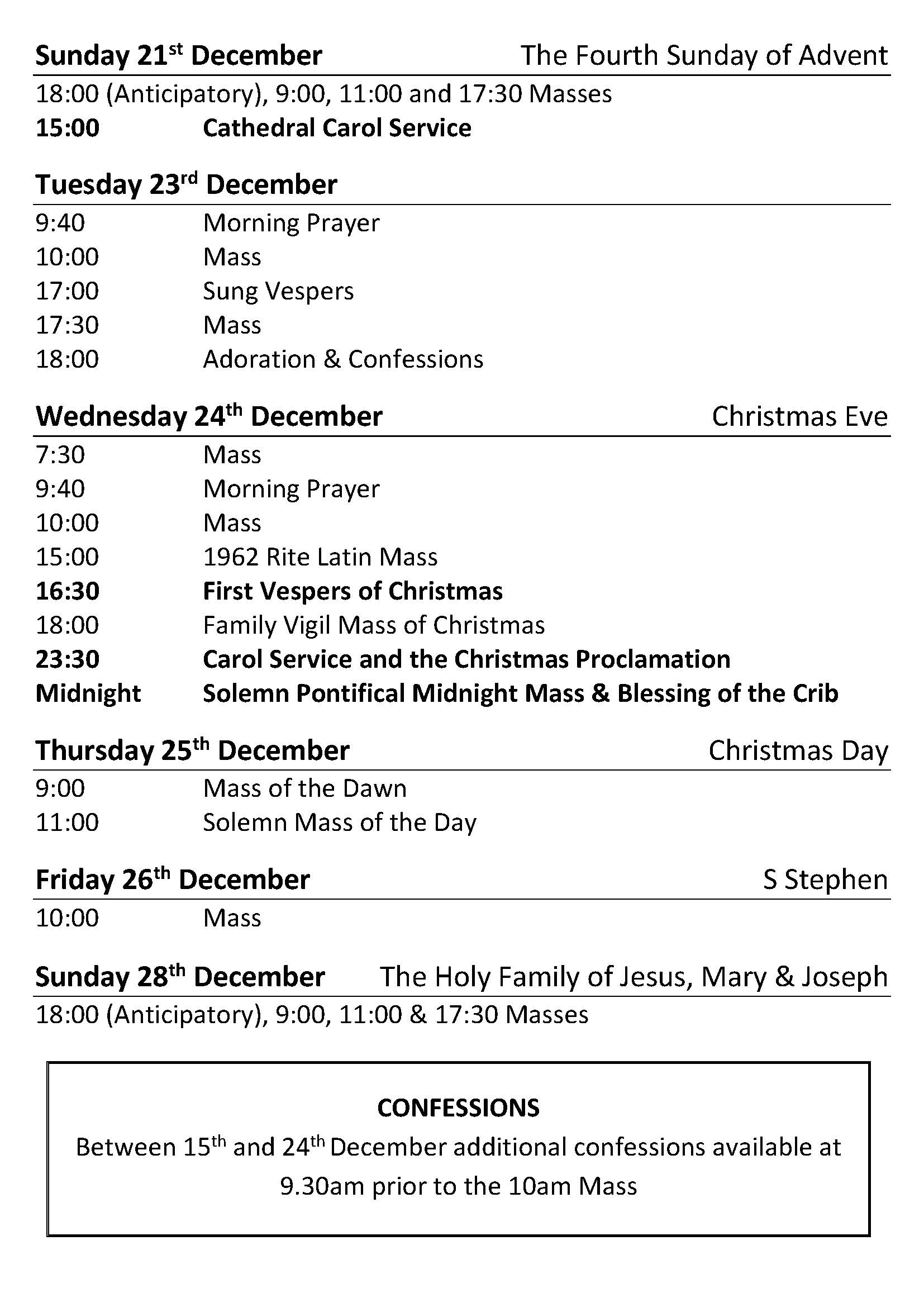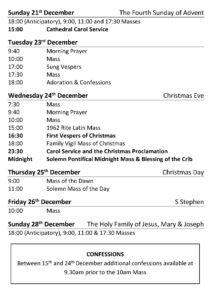 We are looking forward to welcoming visitors and parishioners to the Cathedral during the Advent season and over Christmas, to share the joyful anticipation of the Christ Child and celebrate his arrival. Please take a look at the Mass and service times below: