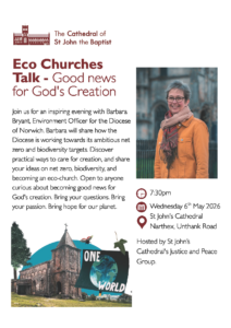 St John’s Justice and Peace group invite you to an inspiring evening with Barbara Bryant, Environment Officer for the Diocese of Norwich. She’ll be delving into issues such as net zero and biodiversity and practical ways to care for creation.