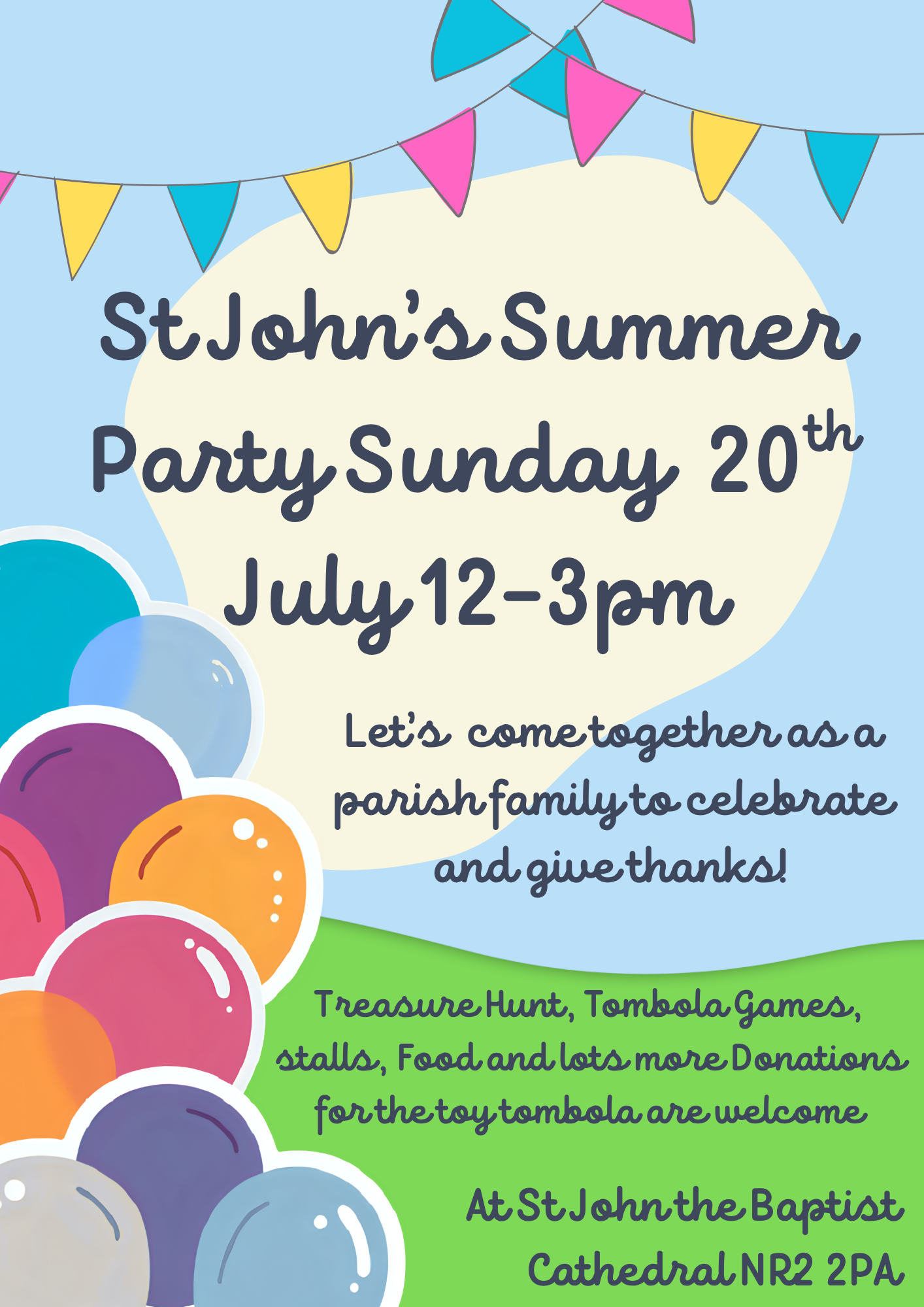 Parish Summer Party – 20th July 12 -3pm. Join us after the 11am Mass. There will be hot dogs and cakes, games stalls and a treasure hunt and lots more. The sign up sheet for catering and to help out on the day is at the back of the Cathedral.
